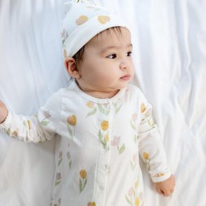 Wrap your baby in springtime softness with this tulip-print jumpsuit and coordinating knot hat — made from breathable organic cotton for all-day comfort. Hand-painted watercolor tulip print Jersey Delicate pico edge on front opening and sleeve openings Knot top hat Front snap opening 100% organic cotton Style # LY33051