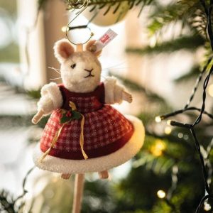 Collectors around the world have fallen in love with our series of Christmas mice ornaments. Our latest addition to the collection, the fifth in the series, will definitely be another fan favorite. With her dainty features, finely airbrushed detailing, and festive frock, this three-way-jointed, wool-plush mouse is a mi