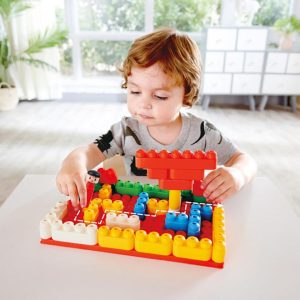 These sturdy blocks will inspire hours of play and generations of builders. Explore how different shapes can make towers higher or wider. How high can you build without toppling over? Build a house and tell stories about who lives there. Sturdy, solid, and including all of our favorite colors, this Hape block set inclu