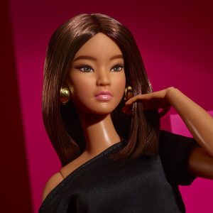 The 2025 Barbie Holiday Doll is ready to embrace the delights of the season in style. She’s dressed for festive revelry in a voluminous gown with a silver and golden brocade pattern – an homage to holiday décor. The dress is packed with glamorous details, including a dramatic tulle-accented neckline and an oversized bo