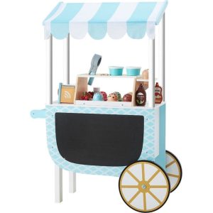 Enjoy summer year-round with the Teamson Kids' My Little Helper Ice Cream Cart. This Robin's egg blue and white cart features a striped awning, rolls on two wheels, and has a pair of sturdy legs for a stable shop. The double-sided design boasts a chalkboard panel on one side and a pretend cash register with…
