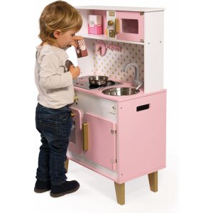 Budding bakers will adore this stylish, retro style mini wooden kitchen, full of interactive features for hours of realistic play value.Ā  In a soft pastel and natural wood design, this high quality, sustainable toy is made from solid FSCā„¢ – certified wood and comes complete with a range of cooking utensils. Ages 3 yrs