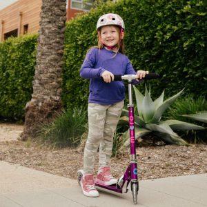 The award-winning Micro Sprite, honored as the Best Scooter for Big Kids by Parents.com, now dazzles in a head-turning Pearl finish. Watch as the Blue hue transforms into a captivating Purple tint under the light, while the LED wheels boast an eye-catching pearlized look. More than just a mode of transportation, this M