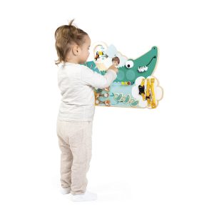 Hidden in the middle of the jungle, Croco is just waiting for your child to come and play and discover more than 14 activities! This comprehensive toy includes: a maze to manipulate, a rotating eye with sound, 3 straps with different fastening systems, chameleon gears, a bell, a metal lock, a hidden mirror, an abacus…