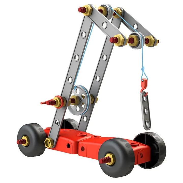 Now completely renovated, with new elements and new design. Every young engineer can build objects from the real world. The set is made of durable plastic and includes a spanner, screws, pulleys, nuts, etc. Various designs are included. 8 large size cards included. Detailed examples of construction with progressive sta
