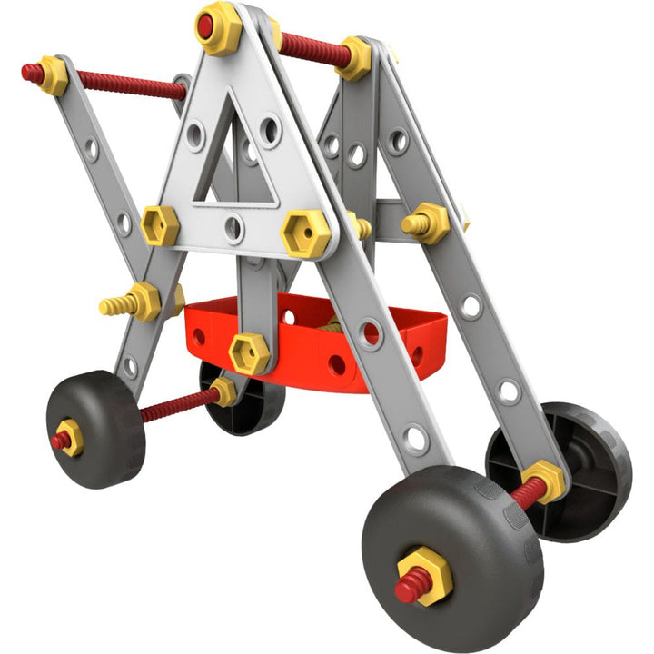Now completely renovated, with new elements and new design. Every young engineer can build objects from the real world. The set is made of durable plastic and includes a spanner, screws, pulleys, nuts, etc. Various designs are included. 8 large size cards included. Detailed examples of construction with progressive sta