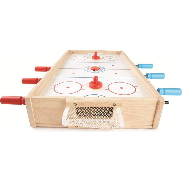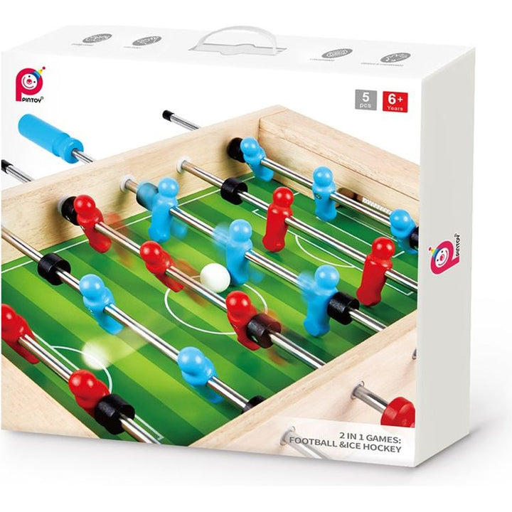 Games for 2! Foosball or Ice Hockey take your pick with this 2 sided table top game designed for fun, improves fine motor skills, concentration, co-operative play and logical thought. Ages 3+ Materials: Wood, Steel Care instructions: Wipe with damp cloth, air dry; do not immerse in water PLEASE NOTE: This item is exclu