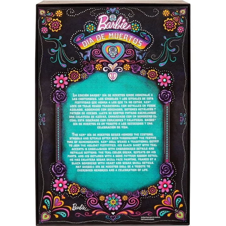 Celebrate the vibrant and beloved Mexican holiday with our 2024 Día de Muertos Collection. Ken doll looks striking in a black satiny suit with turquoise accents and embroidered details. He completes his look with calavera face paint, a silver belt, and a wide-brimmed sombrero. While sold separately, both Barbie and Ke