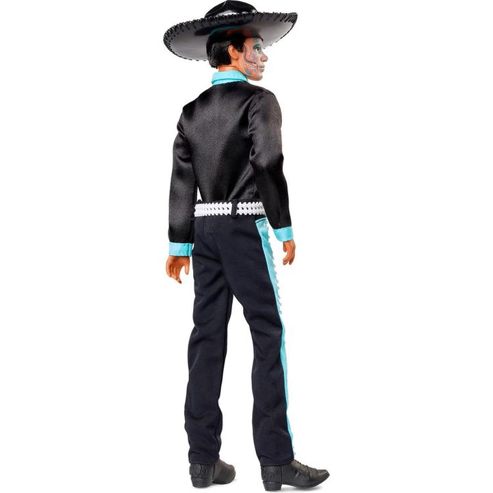 Celebrate the vibrant and beloved Mexican holiday with our 2024 DÃa de Muertos Collection. Ken doll looks striking in a black satiny suit with turquoise accents and embroidered details. He completes his look with calavera face paint, a silver belt, and a wide-brimmed sombrero. While sold separately, both Barbie and Ke