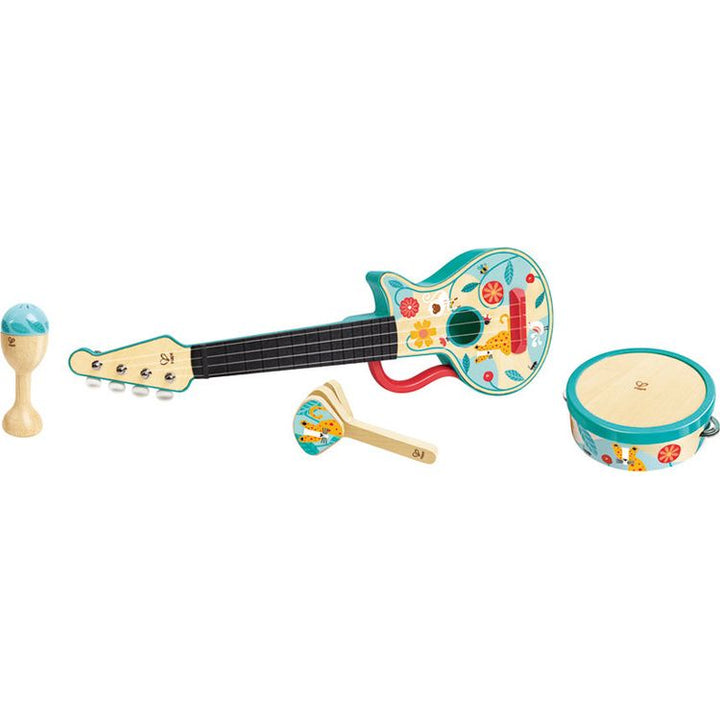 Start your very own band with the bright and vibrant ukulele set. You can invite your friends and family to play your favourite tunes with the realistic ukulele, maraca, tambourine and castanet. PERFECT UKULELE PLAYSET: This playset is made of 4 musical instruments: a maraca, castanet, tambourine and a ukulele. HELPS W
