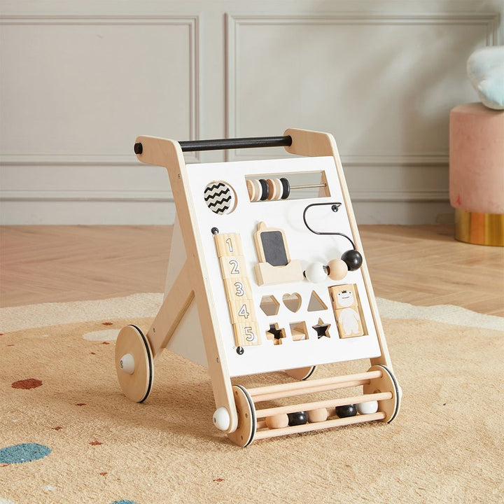 Whether your little one is a sitter, squatter, stander or walker, they will love our Awesome Activity Walker. The sitting baby can sort the 6 shapes into the shape sorter, where the hidden shelf will catch the pieces. They can also play with the cell phone that fits into its own holder. Or try the squares that make cha