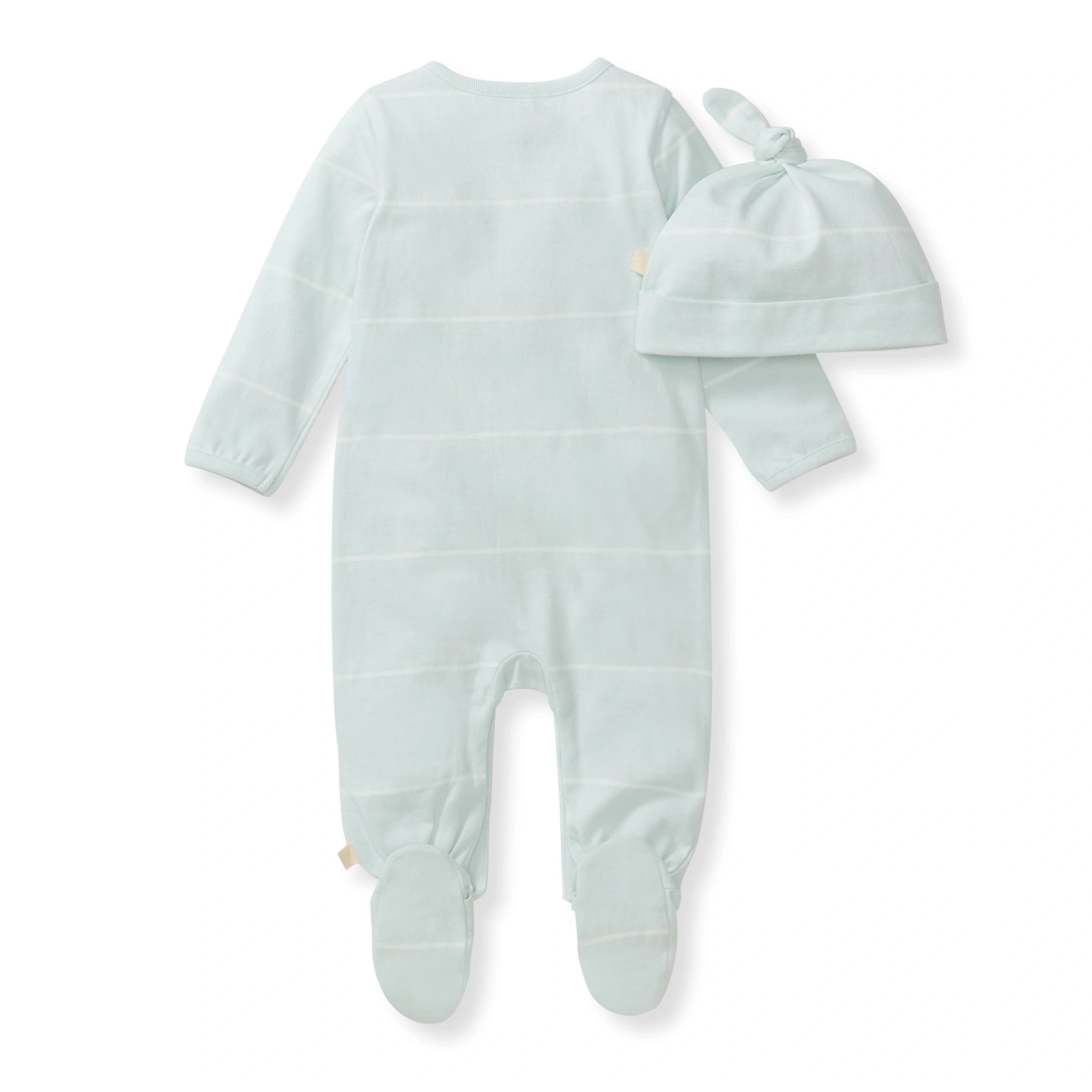 Wrap your baby in cozy charm with this blue striped jumpsuit and coordinating hat — perfect for everyday adventures. snuggles. and playtime fun.