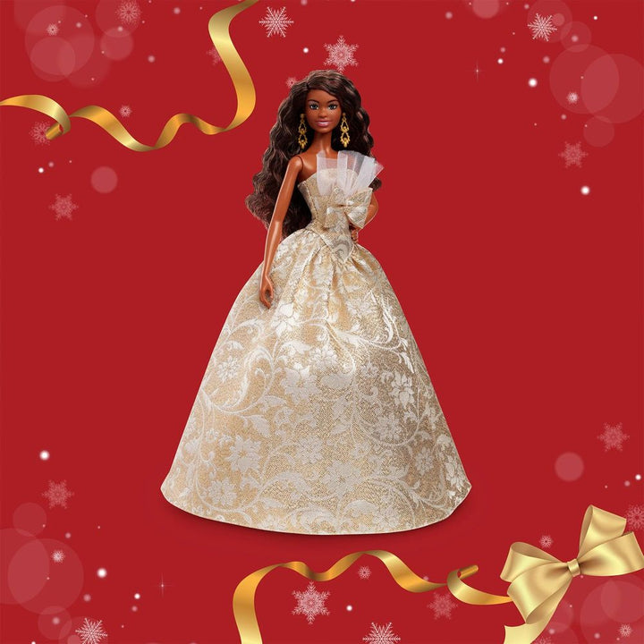 The 2025 Barbie Holiday Doll is ready to embrace the delights of the season in style. She’s dressed for festive revelry in a voluminous gown with a silver and golden brocade pattern – an homage to holiday décor. The dress is packed with glamorous details, including a dramatic tulle-accented neckline and an oversized bo