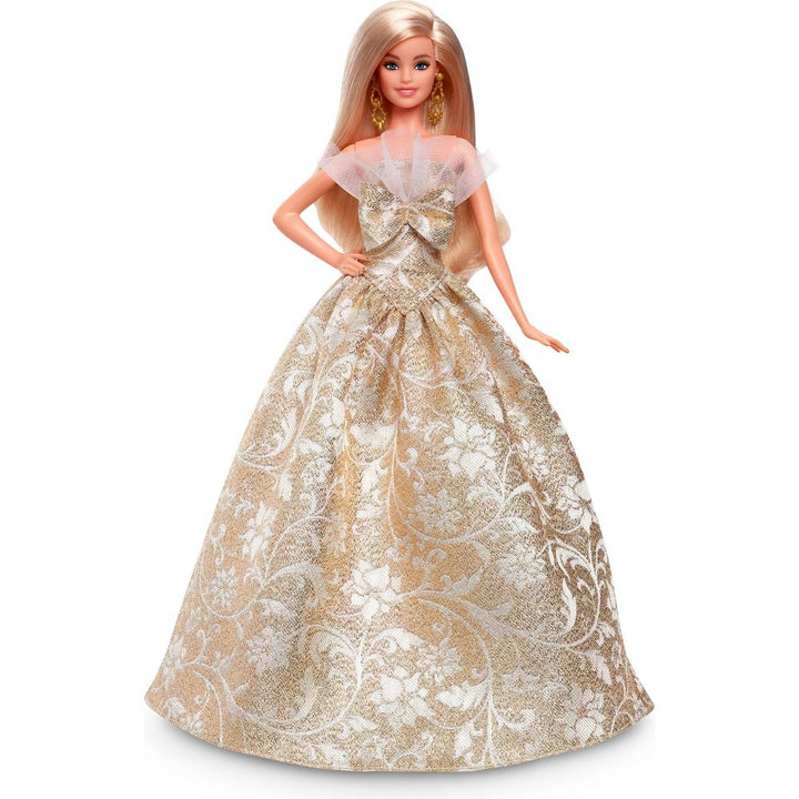 The 2025 Barbie Holiday Doll is ready to embrace the delights of the season in style. She’s dressed for festive revelry in a voluminous gown with a silver and golden brocade pattern – an homage to holiday décor. The dress is packed with glamorous details, including a dramatic tulle-accented neckline and an oversized bo