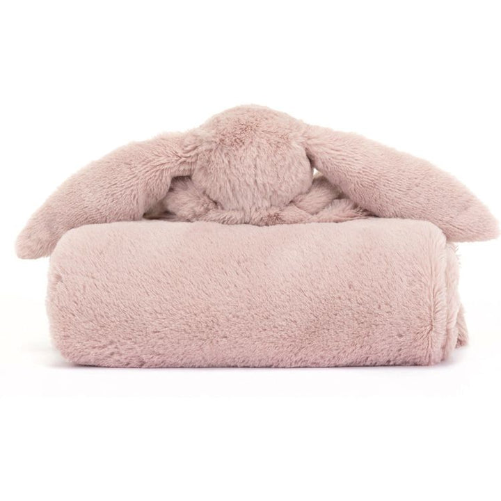 Bashful Luxe Bunny Rosa Blankie is a gorgeous large blanket with bunny head and arms in luxuriously soft rose-pink fur. A soft spot for resting or for tummy time, this blankie is tied with a grosgrain printed ribbon, and presented in an elegant Jellycat gift box with note card and envelope. An indulgent gift for a new