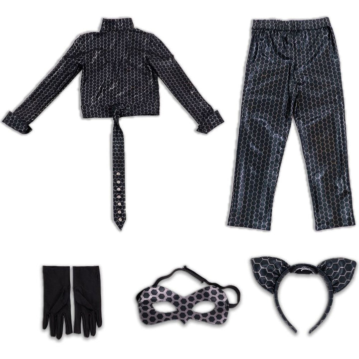 Unleash your inner feline hero with our A Leading Role Cat Noir Child Dress Up Set; the officially licensed Cat Noir 4 pc. costume set celebrates a decade of purr-fect partnership! Featuring an iconic ear headband, sleek eye mask, and a stylish zipper-front jacket with bell charm and belt tail detail, with matching pan