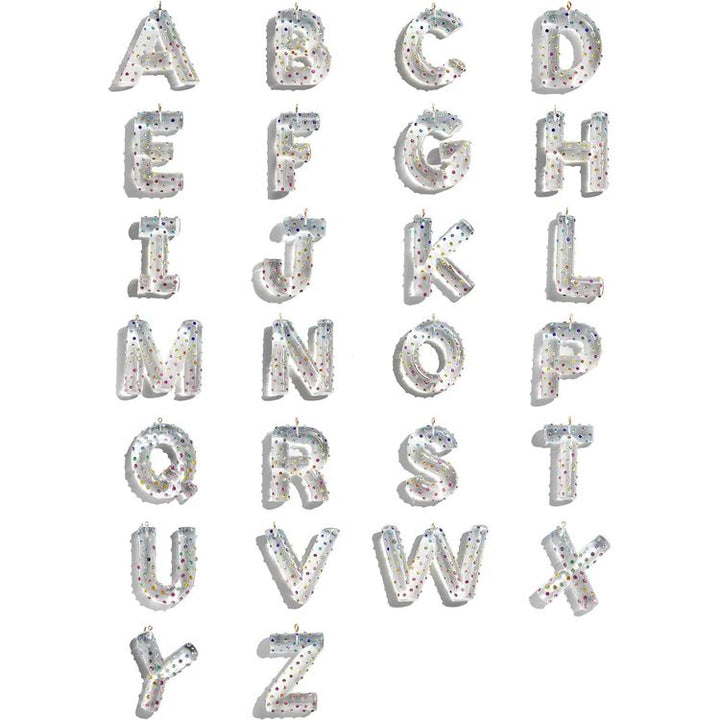 Add some vibrant hues to your bag with the Confetti Initial Bag Charm. Featuring the letter of your choosing in a bold, bubble-letter font, embellished with dainty multicolored stones for added sparkle. Keychain closure Clear initial with rainbow studded gemstones. Dimensions: 5.07" x 2.4"  Ages 3+ Materials: 60% res