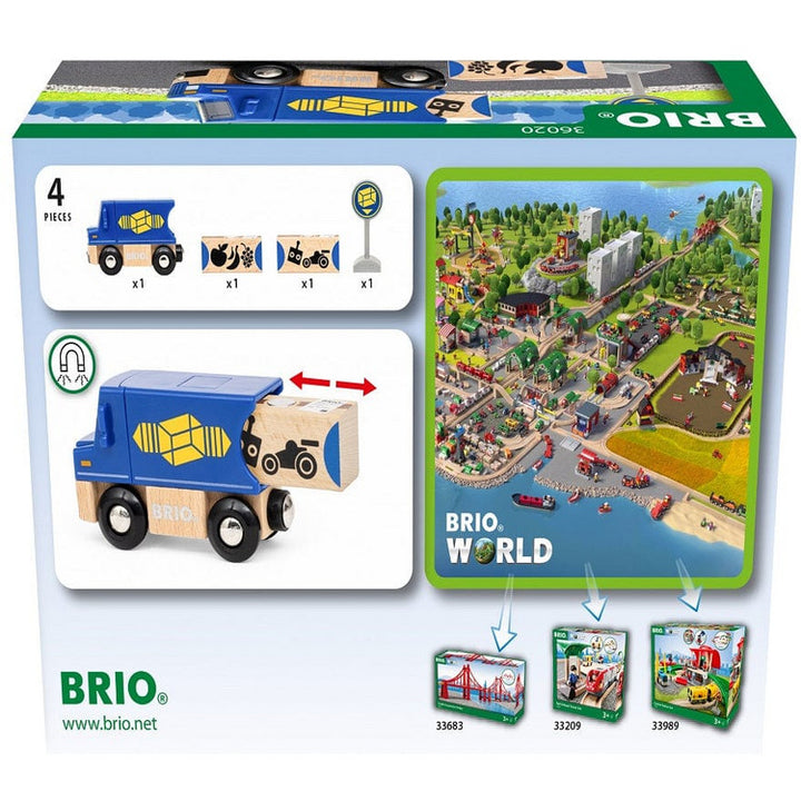 Beep beep! There’s a package for you on board the 36020 Delivery Truck. Stop at the marked delivery spot and unload the wooden goods from the back of the blue toy truck. Then drive to the next delivery, load it up and lock it into position with the help of magnets. It’s a busy day for the BRIO World delivery services s