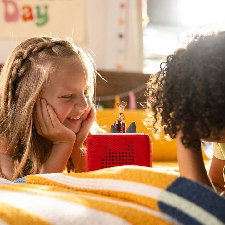 Meet the Toniebox – a new audio system designed for little listeners. Turn it on, pop a Tonie on top and let the audio adventure begin! Screen-free listening that inspires your kids’ imagination in ways that over-stimulating flashing screens do not. This set includes: – One red Toniebox – A charging station to power yo