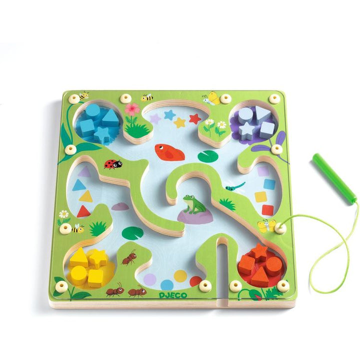 FrogyMaze is a magnetic sorting game for ages 3 and up. Using the magnetic pen, move the pieces according to their shape and color to sort them into the 8 spaces on the board. The "color" spaces are identified by a colored flower, and the "shape" spaces show the different pieces to be sorted. You'll need to travel alon