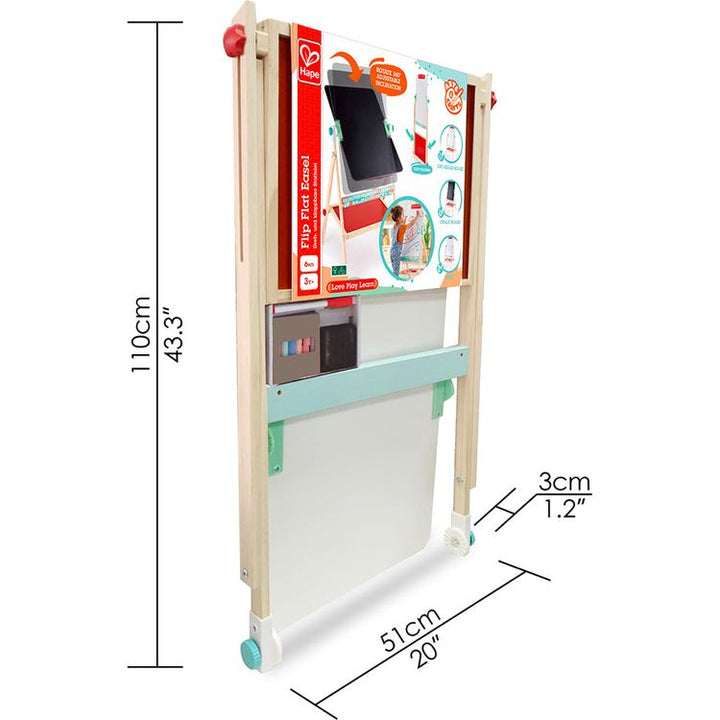 Hape's Flip Flat Wooden Easel is the ultimate arts and crafts toy for kids. Flip the double-sided easel with a whiteboard on one side to reveal on the other side, a chalkboard – both are ideal for drawing or learning and clean easily. This kid’s art easel allows your kid to paint, write or draw with chalk, making it th