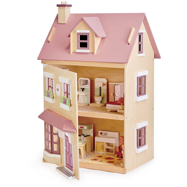 Foxtail Villa is the perfect town-style dolls house.  The subtle colours and top-quality FSC plywood fascia make this a beautiful mid-size dolls house for any little boy or girl, with a clever design to lift and hold the roof to access the attic. Included is a starter set of matching furniture: A cooker, sink unit, tab