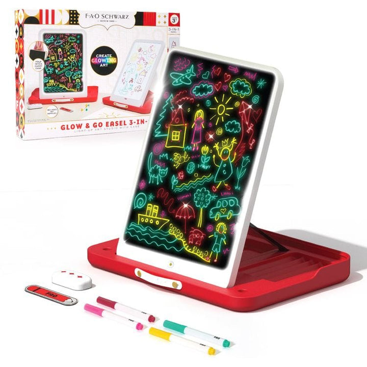 Unleash your child's creativity anywhere with the FAO Schwarz® Glow & Go Easel, a 3-in-1 Light-Up Art Studio that’s designed for versatile drawing and portability. This innovative art studio lets budding artists use it as a whiteboard, a neon glow board, or attach paper for traditional or tracing drawing methods. E