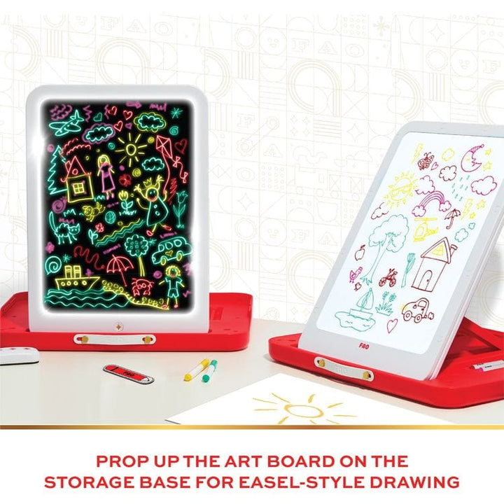 Unleash your child's creativity anywhere with the FAO Schwarz® Glow & Go Easel, a 3-in-1 Light-Up Art Studio that’s designed for versatile drawing and portability. This innovative art studio lets budding artists use it as a whiteboard, a neon glow board, or attach paper for traditional or tracing drawing methods. E