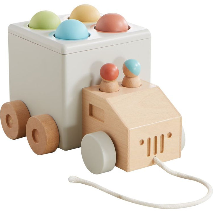 So much to keep baby busy with our Hammer Time Pull Toy. Not only is it a fun pull toy with little wooden drivers, but it’s also a pounding toy and a color matching game. Kiddos will love to pound the giant wooden balls through the matching color holes, then let them all come out by releasing the rear door. Comes wi