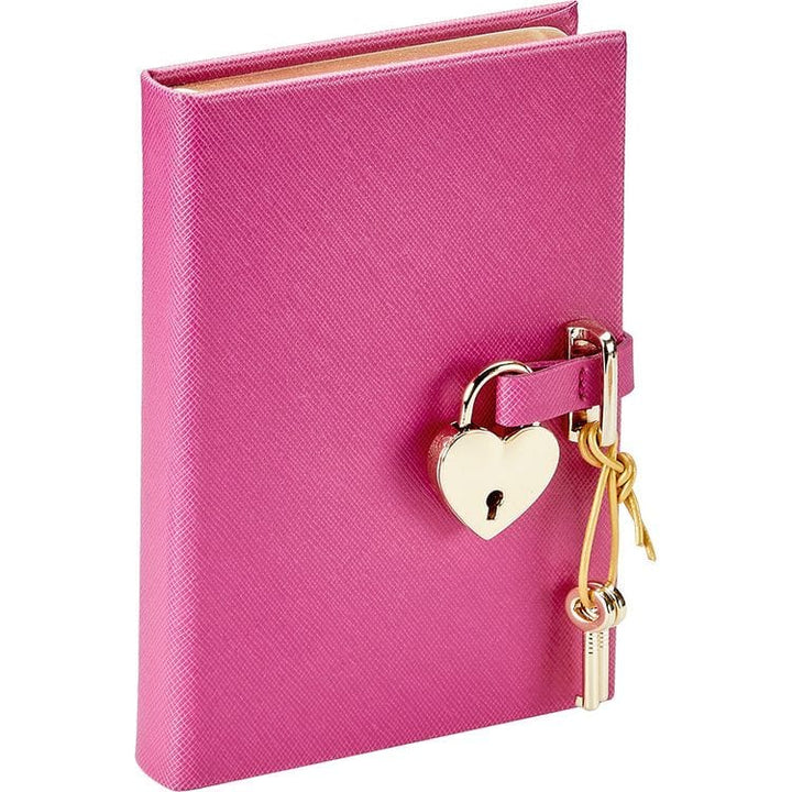 This elegant diary features a fully functional heart lock with key so you can keep your secrets locked away. Includes 240 lined cream-white, acid-free archival pages with gilt edges and a double-faced cream satin ribbon marker. Saffiano Hard cover diary with squared corners Smyth-sewn for strength and longevity 240 lin