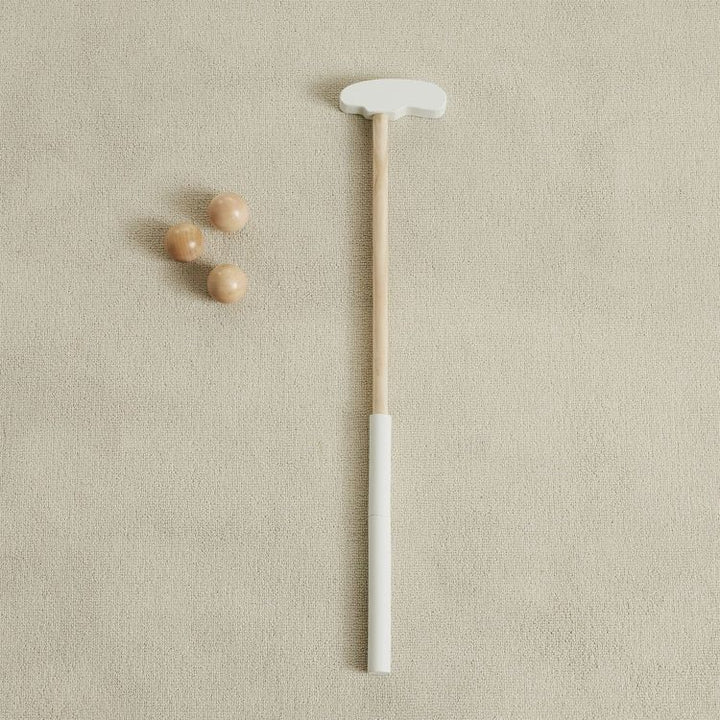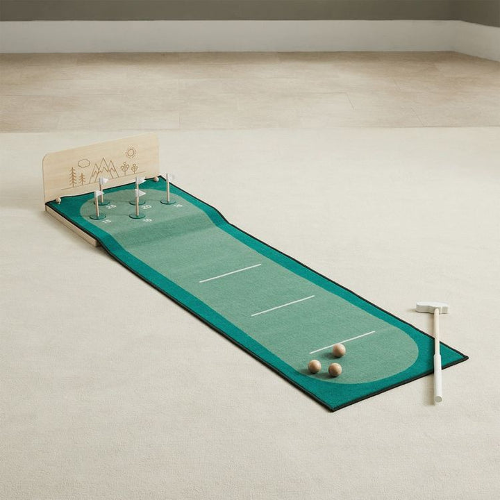 Practice the perfect putt with our Keen Putting Green! Every little tiger will love our practice putting green which overlooks a resplendent view of the mountains and sunshine (etched into a plywood backboard). Comes complete with 5 flags on wooden bases that fit into holes with printed scores, an adjustable height g