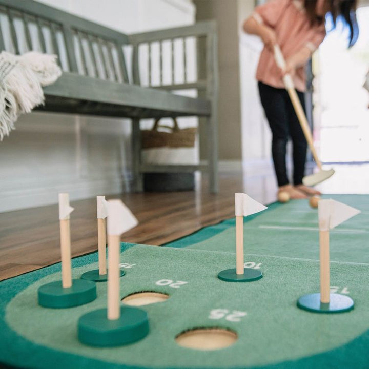 Practice the perfect putt with our Keen Putting Green! Every little tiger will love our practice putting green which overlooks a resplendent view of the mountains and sunshine (etched into a plywood backboard). Comes complete with 5 flags on wooden bases that fit into holes with printed scores, an adjustable height g