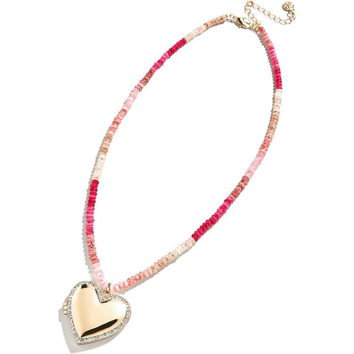 Good vibes, guaranteed! This necklace is adorned with pretty pink beads and a gold heart locket. Sparkling with pavé detailing, it’s a cheerful, eye-catching piece that adds instant joy to your everyday look. Beaded necklace with heart shape locket Length: 16"; 3" extender. Material: Glass stones. Brass casting. Acryl