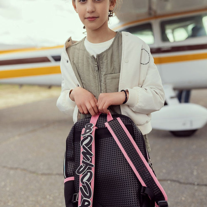 The Starter backpack is perfect for young students ages 3 to 6 yrs old. The bag fits a standard A4 folder when placed to the back of the bag. It does not fit a binder. These featherweight, ergonomic backpacks have sturdy form and structure making them comfortable and stylish! The line expands into sling bags, cosmetic