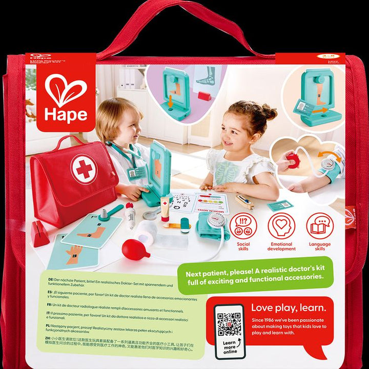 Get ready for hours of imaginative play with the Hape Little Doctor's Medical Set! This fun and interactive set includes all the essentials for budding young doctors, such as a stethoscope, syringe, thermometer, and medicine bottles—all stored in a handy fabric doctor’s bag. Whether checking a patient’s heartbeat, givi
