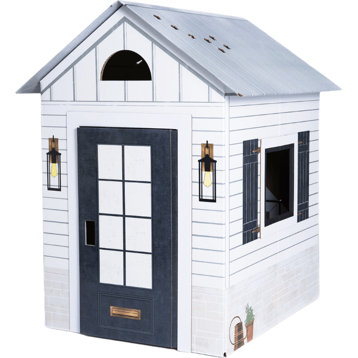 We make playtime fun – and cute! Meet the Modern Farmhouse Playhouse, where rustic charm meets a chic design, welcoming endless days of imaginative play. Enjoy a picturesque facade that goes with your own home interiors with classic white siding, sleek black-framed windows, and a chic metal-seamed roof. Turn up the cut
