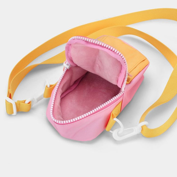 Specially designed to complement the Malibu Barbie FC-11 film camera, this 35mm camera bag is flexible enough to accommodate many different types of point-and-shoot cameras and/or other small goodies. Built from durable yellow, pink, and blue textiles that match the Malibu Barbie FC-11 camera and prominently displaying