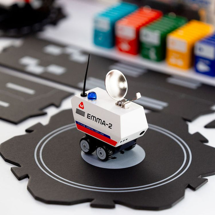 MARGE: Mars Agency for Research + Geographical Exploration The Rogue Echoes play set includes a hi-tech trio of AI-powered vehicles. What's in the box? EMMA-2 comms vehicle with suspension base XB Shuttle with metal propulsion engines ATP with 6 assorted supply containers Puzzle roads Rogue Echoes Comic Book Dimensions