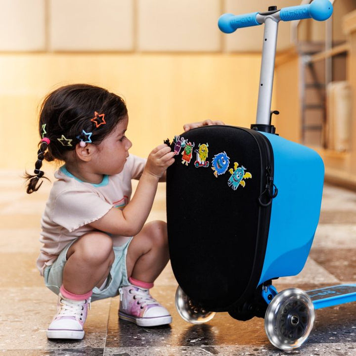 Fun on the go for little ones! The Micro Scooter Luggage Junior LED Patch & Play is both children's luggage and a scooter in one, making it the perfect travel companion for kids between the ages of 3-5 years. Plus, the fun velcro patches turn travel time into playtime! Let the imagination run wild with Monster or M