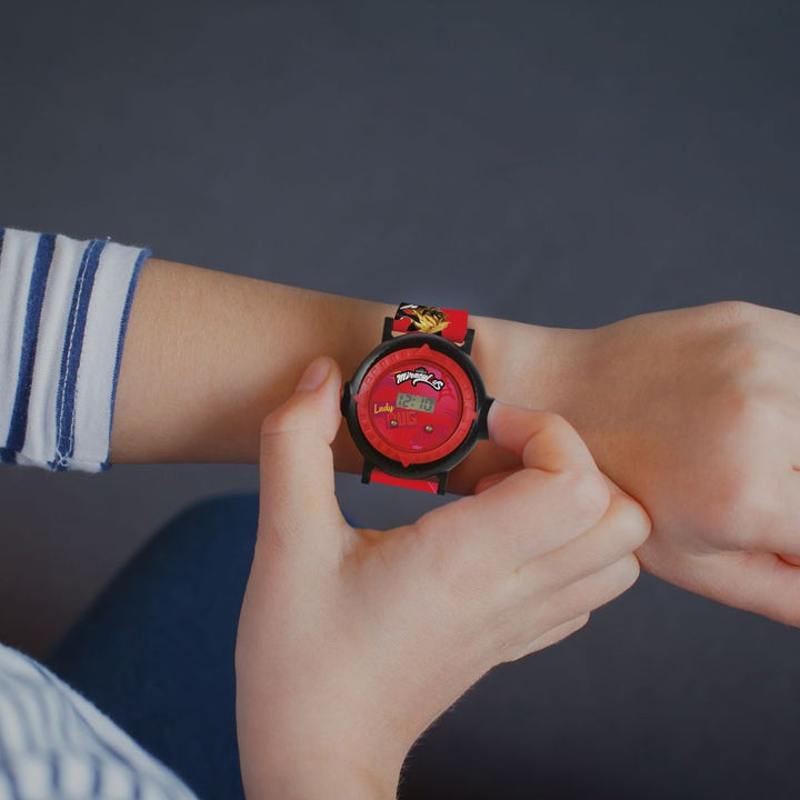 A digital watch with Miraculous design! 20 images of lady bug universe to project wherever you want Communicate with your friends by sending coded messages with your favorite screenings Adjustable strap, perfect for small wrists Rotating ring to choose the image to be projected Time and date display Dimensions: 5.31 x