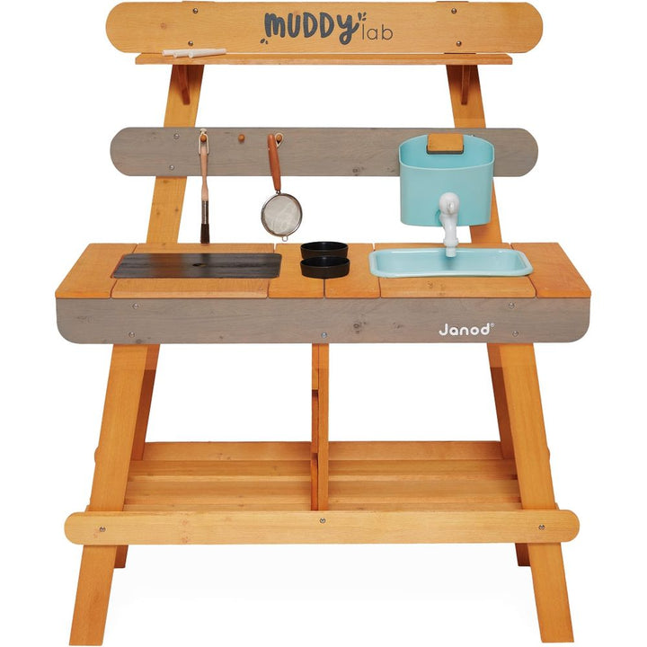 A bit of soil, a few blades of grass, some water, mix it all together, and you have the perfect mud workshop! Let your child thrive in nature and develop their imagination with this solid wood kitchen. Suitable for outdoor use, this toy will withstand all experiments by young and old alike. Delivered with 10 accessorie