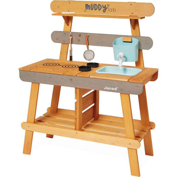 A bit of soil, a few blades of grass, some water, mix it all together, and you have the perfect mud workshop! Let your child thrive in nature and develop their imagination with this solid wood kitchen. Suitable for outdoor use, this toy will withstand all experiments by young and old alike. Delivered with 10 accessorie