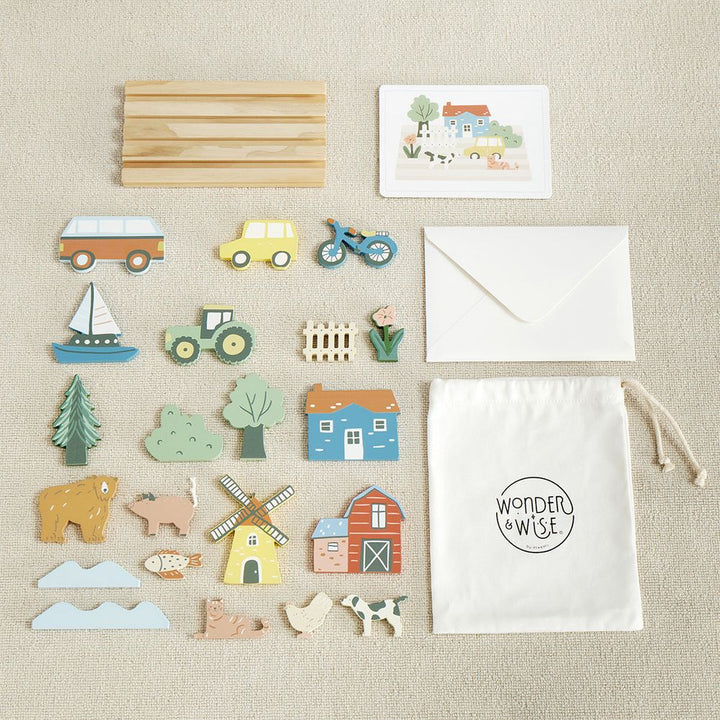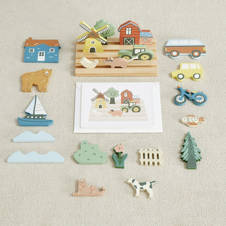 Our My Town Picture Matching Game is a great and fun way to help your kiddos learn placement and sequencing by matching the wooden objects to the pictures. Our high-quality set includes a chunky wooden base that holds 21 assorted vehicles, trees, houses, bikes and more. 12 cardboard pictures with scenes to match. L