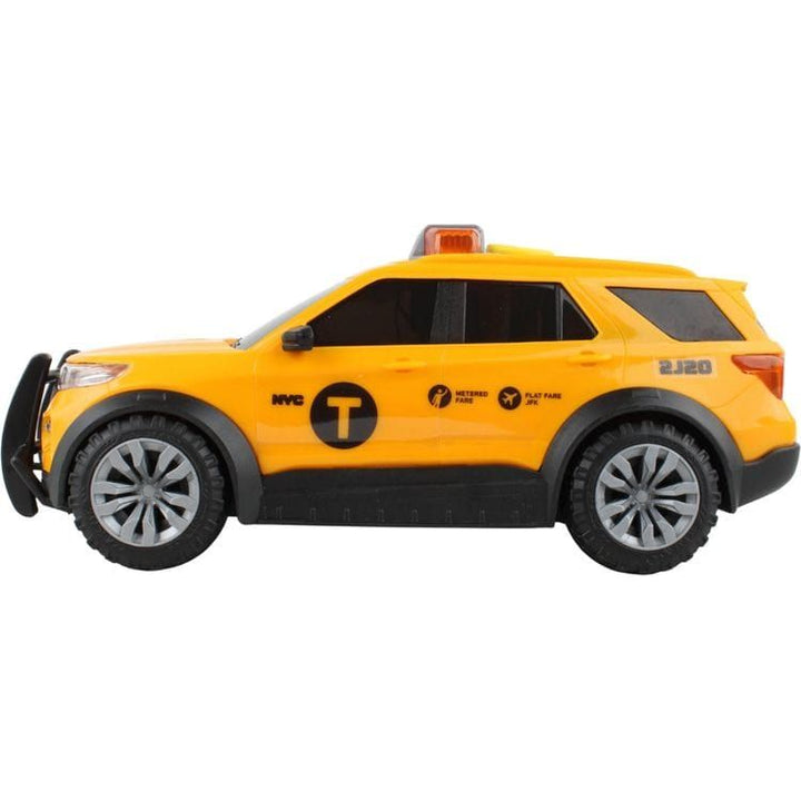 NYC Taxi Ford Escape SUV features light and sound. Free wheeling. Two AA batteries included. 9" long. Lights Sound Free wheeling Two AA batteries included. 9" long Ages 3+ Material Content: Plastic