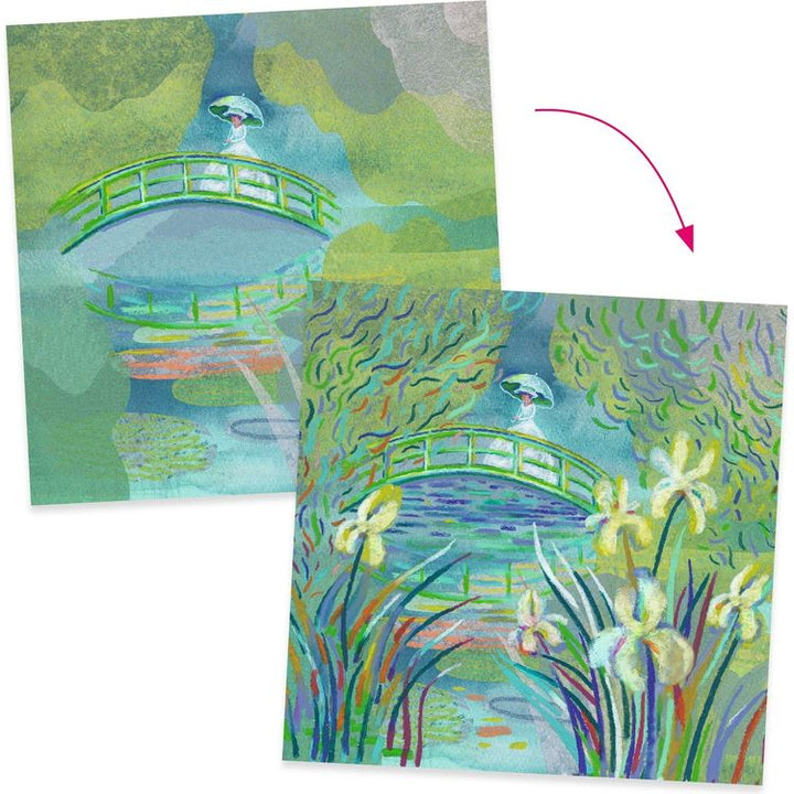 Inspired by the work of Claude Monet, Muriel Kerba offers us a triptych to complete in the impressionistic style worthy of the panoramic frescoes of Monet’s Water Lilies, using touches of color with oil pastels. An introduction to the work of Claude Monet. A contemporary illustrator’s interpretation of the great master
