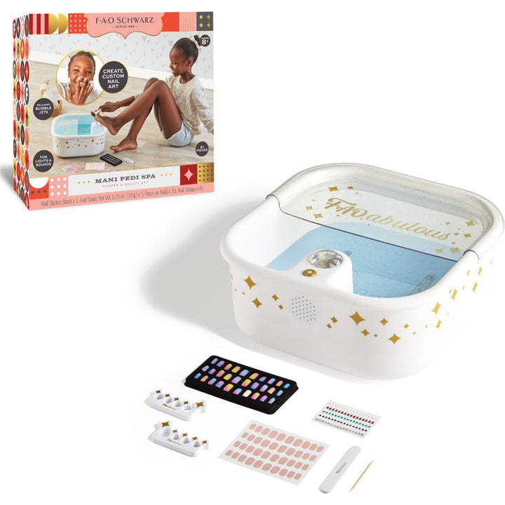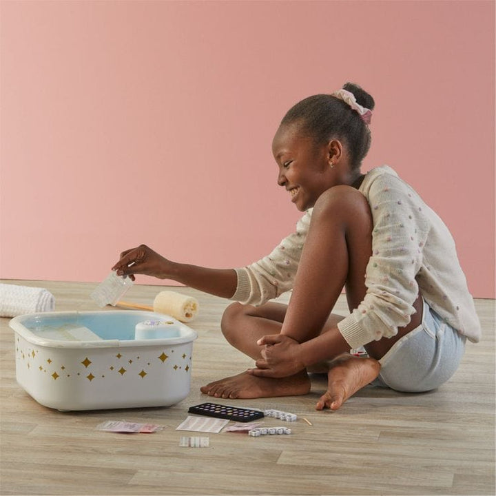Make everyday a spa day with the Mani Pedi Spa Set from F.A.O. Schwarz®. Relax and enjoy a rejuvenating foot bath with bubble jets and included foot soak packets. Complete the experience with built-in LED lights and sounds for a full spa-like experience. After soaking in the tub, use the included accessories to clean a