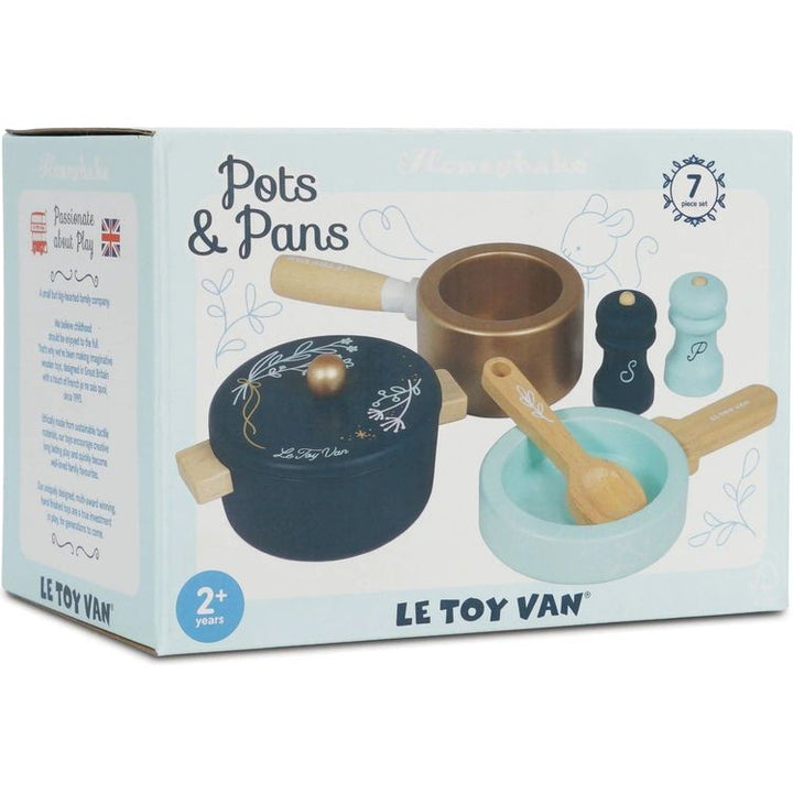 A smart wooden cookware set for budding young chefs. Cook up a feast with this sweet toy which comprises a casserole pot with lid, saucepan, frying pan, wooden spoon, spatula and salt & pepper. Crafted from sustainable solid wood and hand painted in bright hues using water based, child safe paint. A great addition