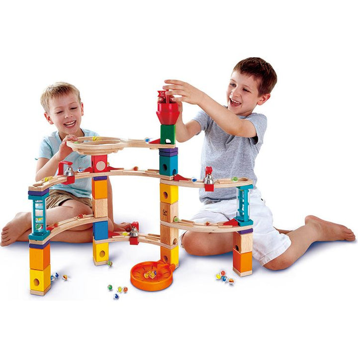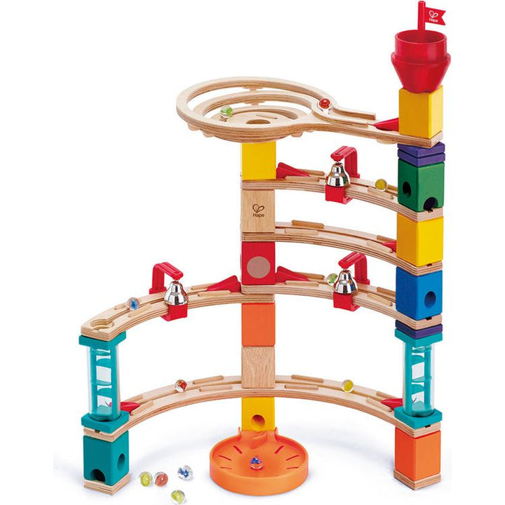 Escape from the castle's rotary tower with this exciting Quadrilla set featuring two transparent stairways. As the marbles make their way down the rail they sound three hanging bells. S.T.E.A.M DEVELOPMENT: This set encourages your child’s development in various science, technology, engineering, art and math skills. CO