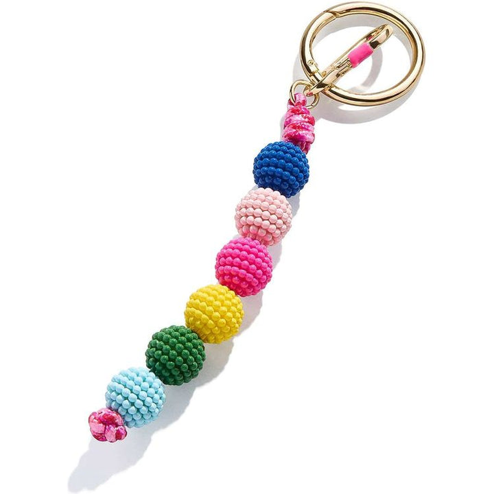 Subtly add some color to your bag with the Reba Bag Charm. Featuring bead-studded stations in a striking rainbow pattern, keep your closet colorful by adding to any bag or keychain. Keychain closure Six colorful beaded stations on a gold key ring. Dimensions: 6.8" x 0.7"Â Ages 3+ Material: 50% acrylic, 30% zinc casting