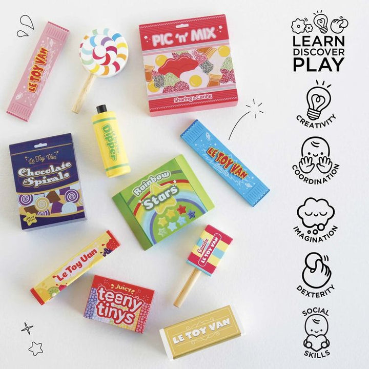 Take a trip down memory lane with this nostalgic Pic 'n' Mix set, made for retro role play fun. Sweet tooth's will delight at this cute set which features an assortment of tasty treats plus a stripy sweetie bag for all the fun without the sugar rush!  Each wooden toy sweet is beautifully decorated with unique illustrat